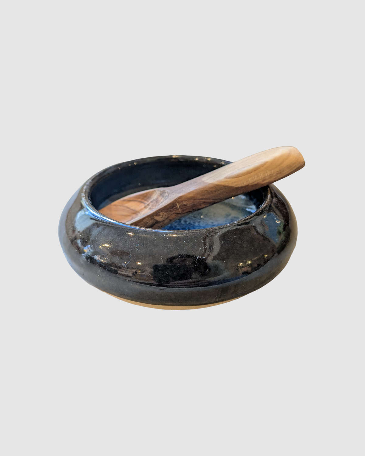 Hånddrejet saltkar med træske - Laguneblå glaseret