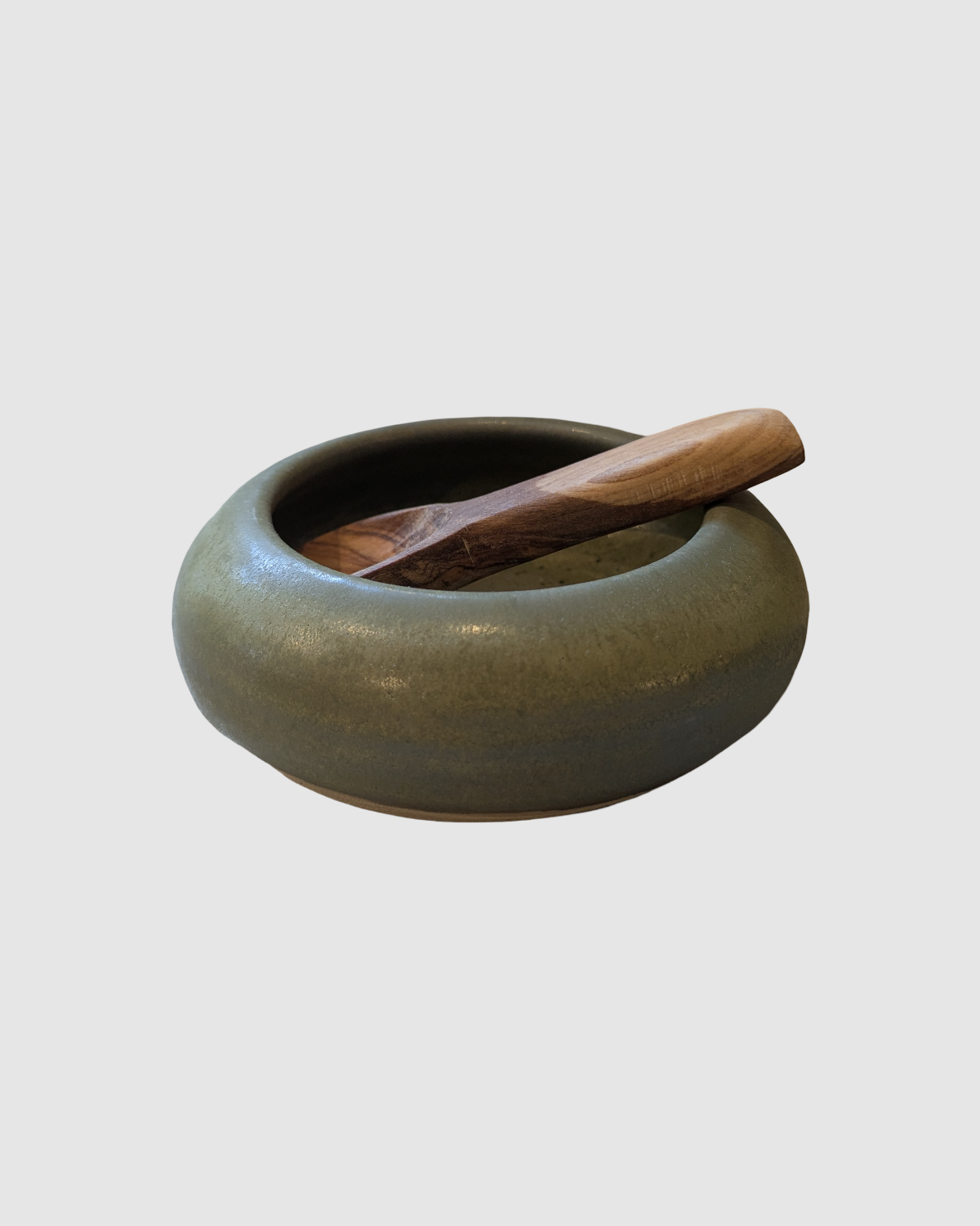Hånddrejet saltkar med træske - Muteret grøn mat