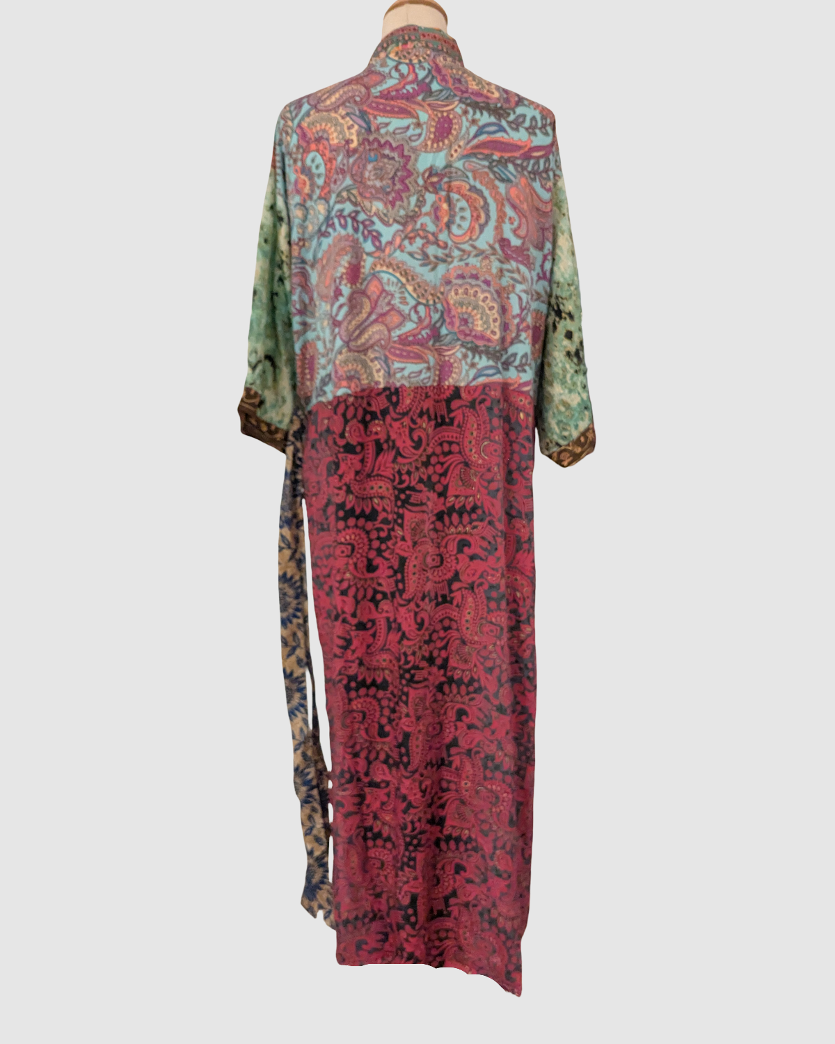 Lang silke kimono i blomstret blå, rød og mint- Håndlavet i Indien - Elsa