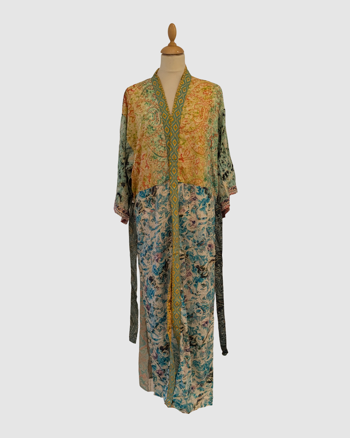 Lang silke kimono i gul, grøn og turkis- Håndlavet i Indien - Zara
